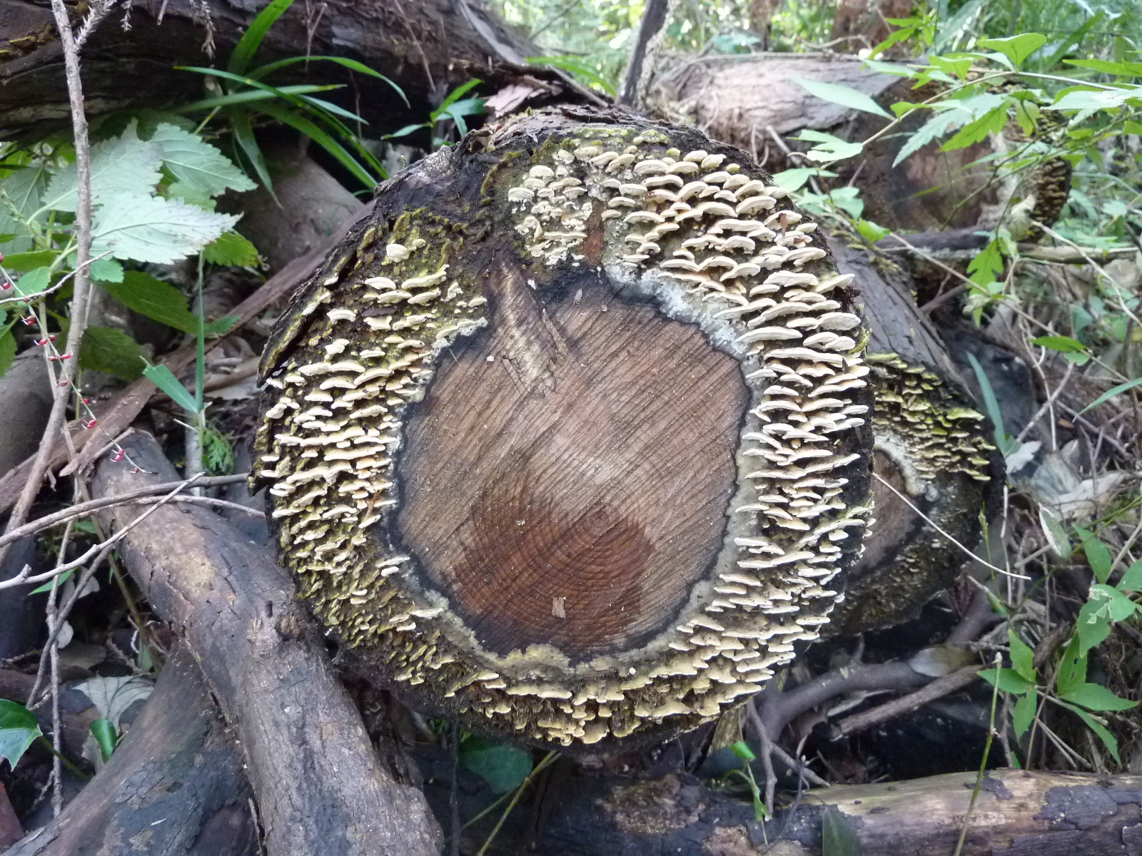 赤身と呼ばれる木材の芯の部分は、まわりの白太と呼ばれる部分より腐りにくいらしい。 こうした白太にだけキノコが生えている光景は森の中でよく見かけます。