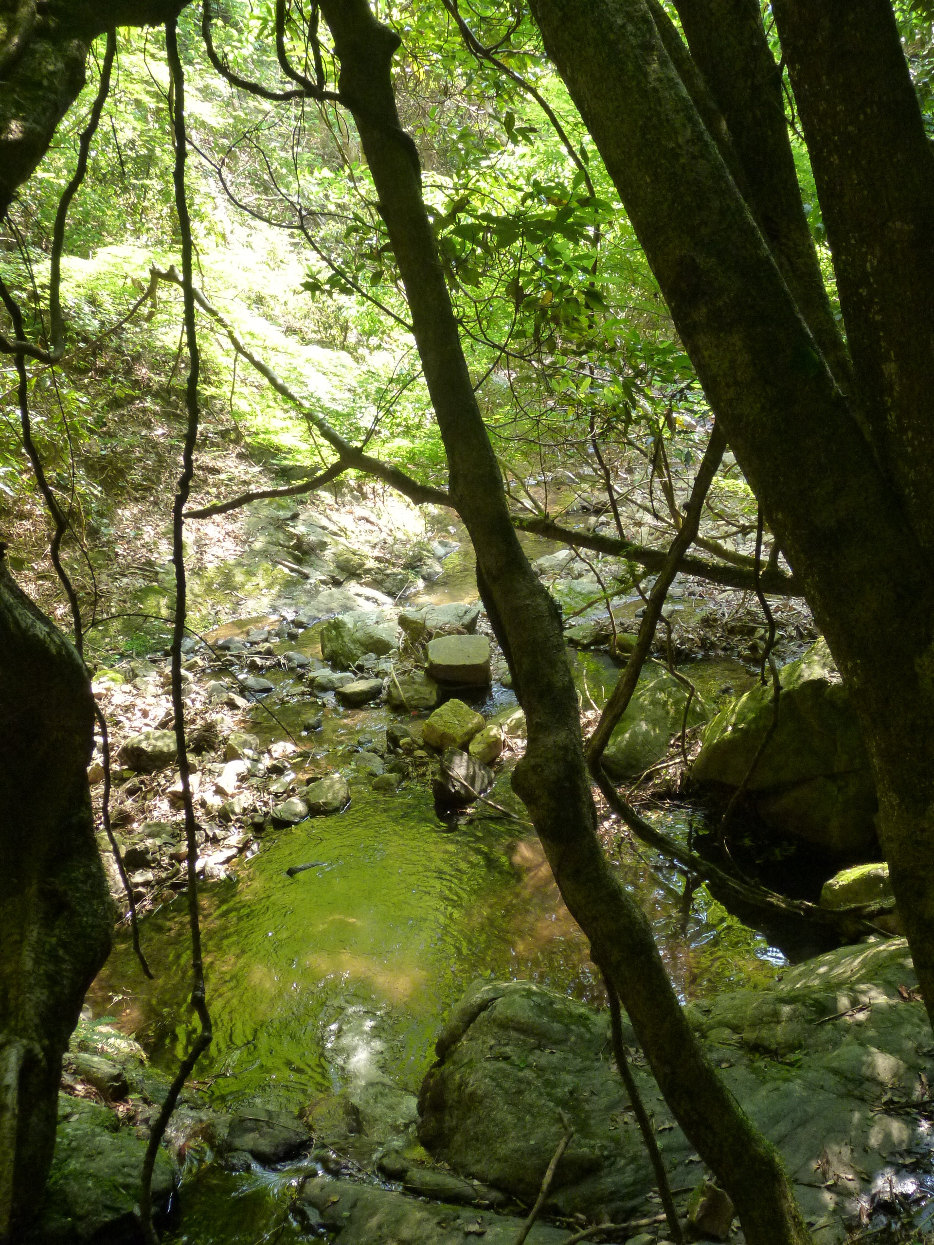 奈良春日山原生林の清流に森の色が写り、清涼感が増します。市内の気温とは明らかに違う涼しさです。