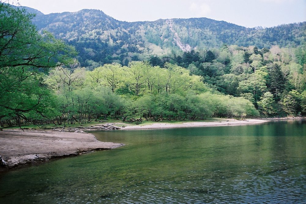 刈込湖は日光の一番奥の神秘な山の湖。初夏の頃は周囲の山腹を覆う新緑に酔いしれてしまいます。山並みの上は金精峠あたり。