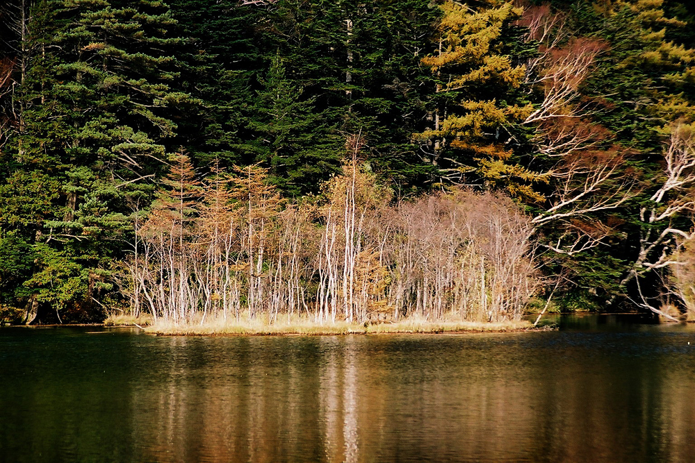 原生林に囲まれた森の湖(明神池)にこんな浮島が。