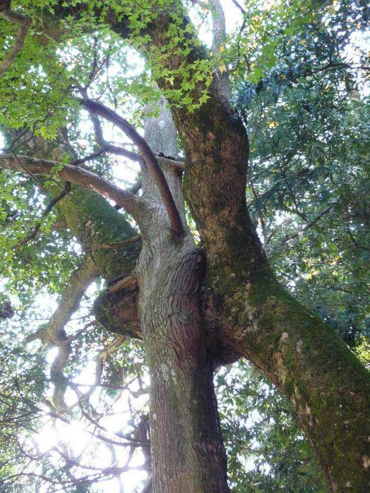 樹齢は80年くらいですが、真っ直ぐ立っているスギの木の地上6mくらいのところにタブノキが斜めに、まるでスギの木を貫通しているように見えます。