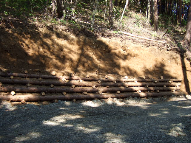 山地保全や水源涵養に貢献する大橋式路網(作業道)では、切り開いた道を間伐材で土どめします。
