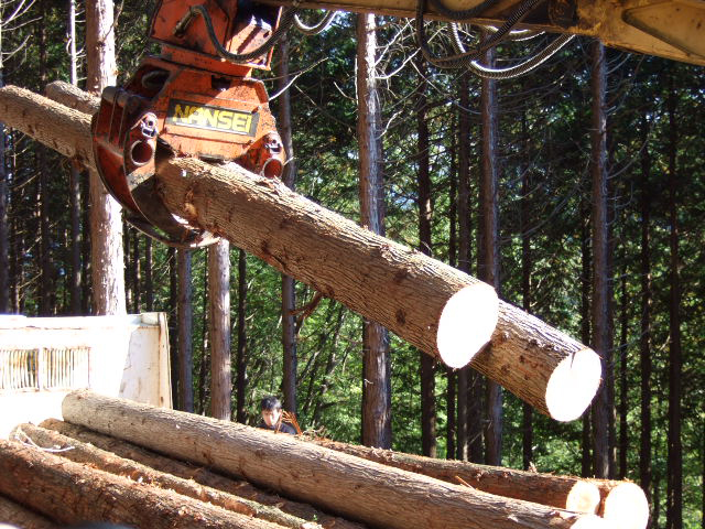 伐採した木を同じ長さに切ったら、グラップルという重機でつかんで、トラックに運びます。