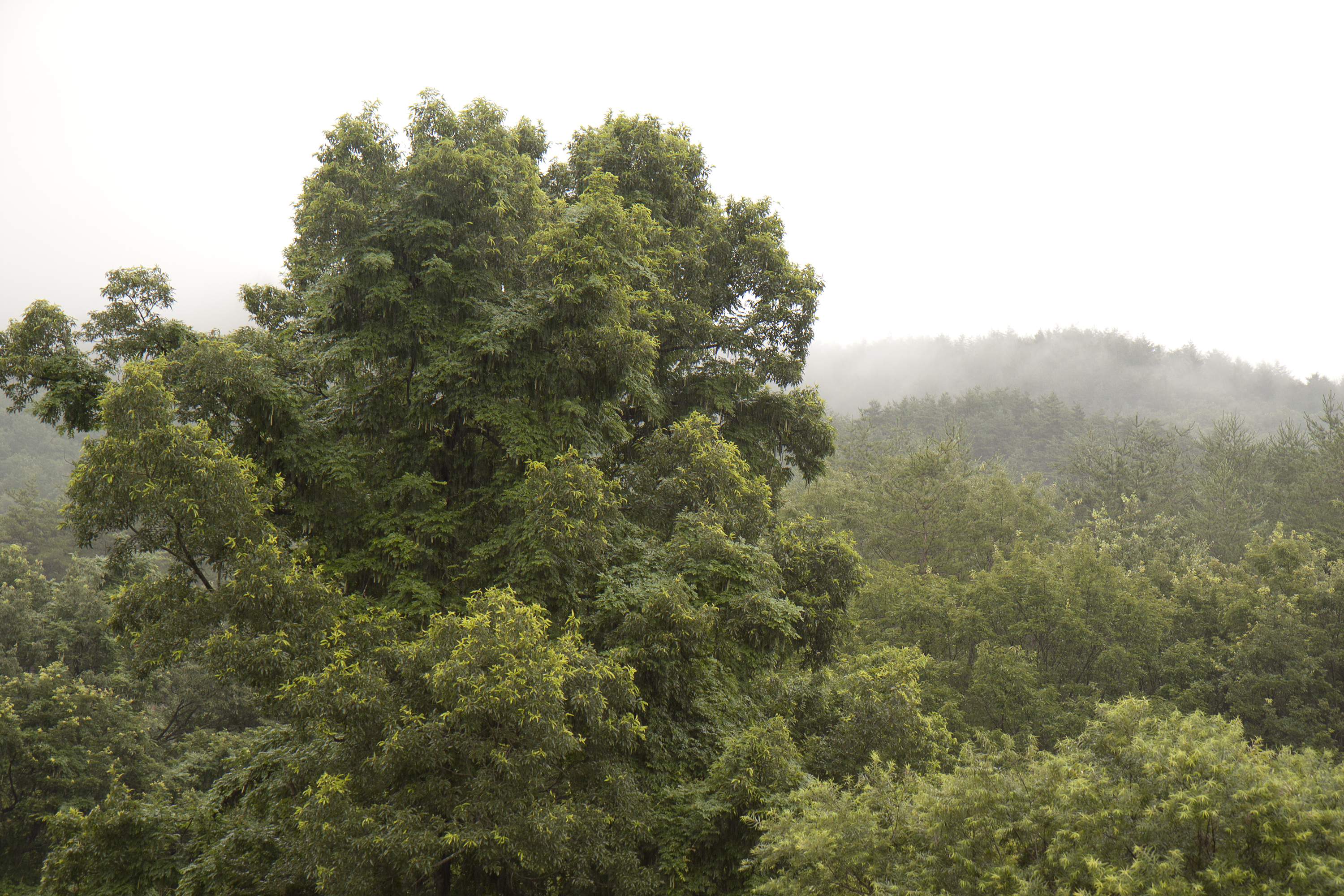 周囲とは明らかに大きさが異なるひと塊の木々が、大きな生き物のよう。雨と霧の演出でよりいっそう。