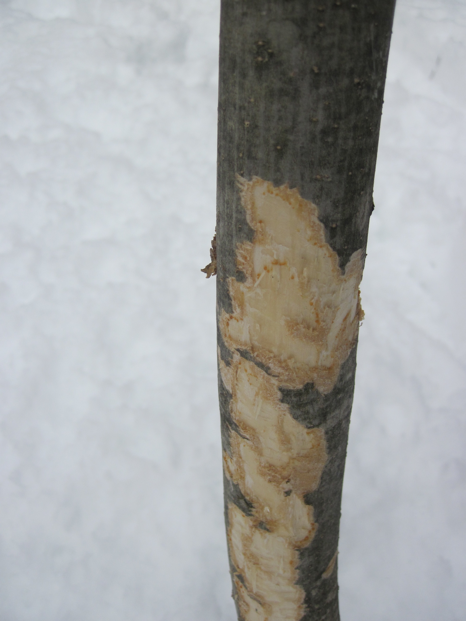 こうして樹皮が食べられてしまうのですねー。歯で削り取った痕が痛々しい。でもシカにもシカの事情が。。