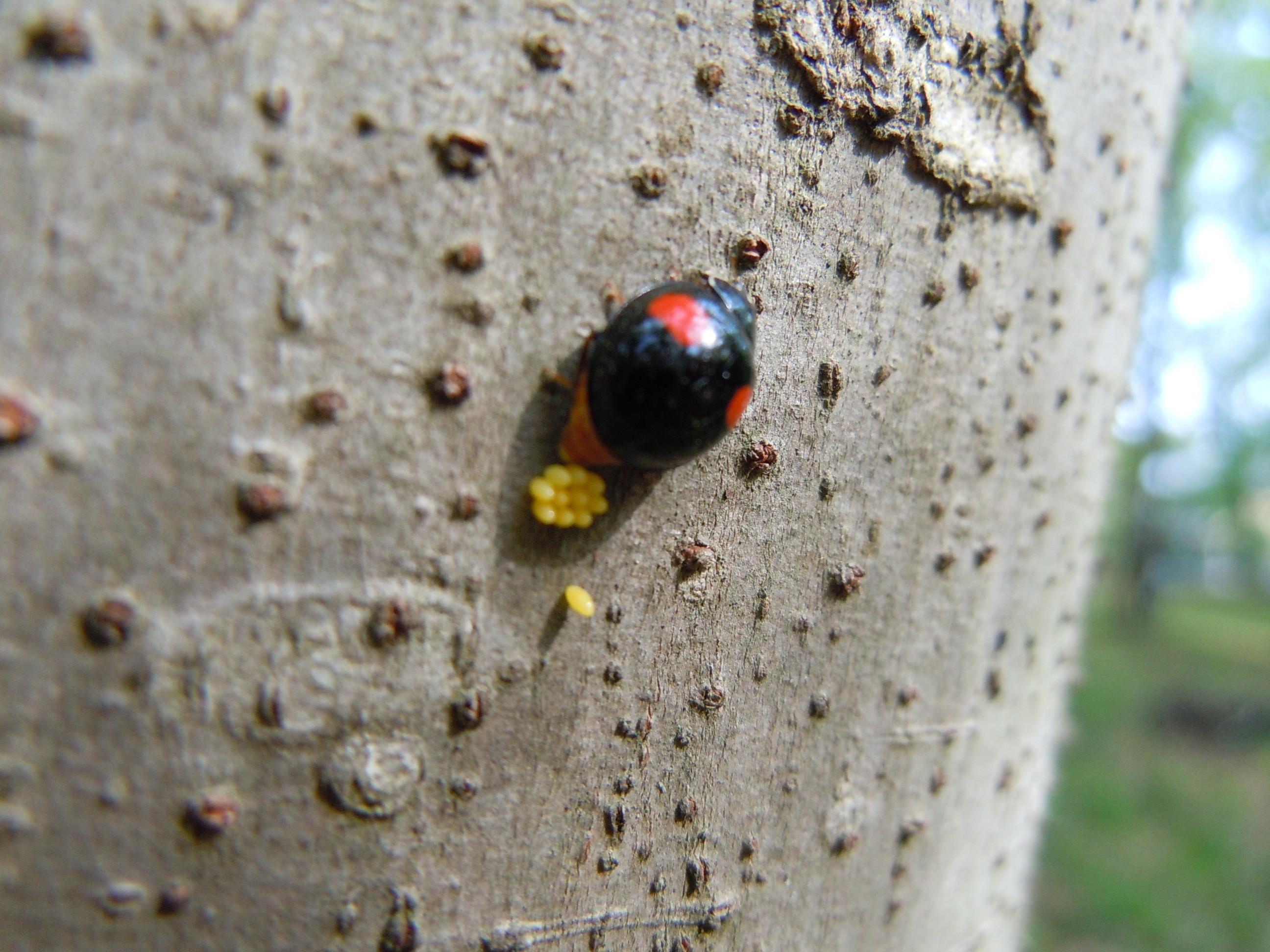 てんとう虫のことを考えながらふと脇の木を見たらてんとう虫が何匹も幹を這っていて、よくよく見たら木の幹のあちこちに卵が産みつけられていて、もっと見たら産卵している最中のてんとう虫まで見つけた。個人的には「奇跡」と言いたいくらい。感動しました。