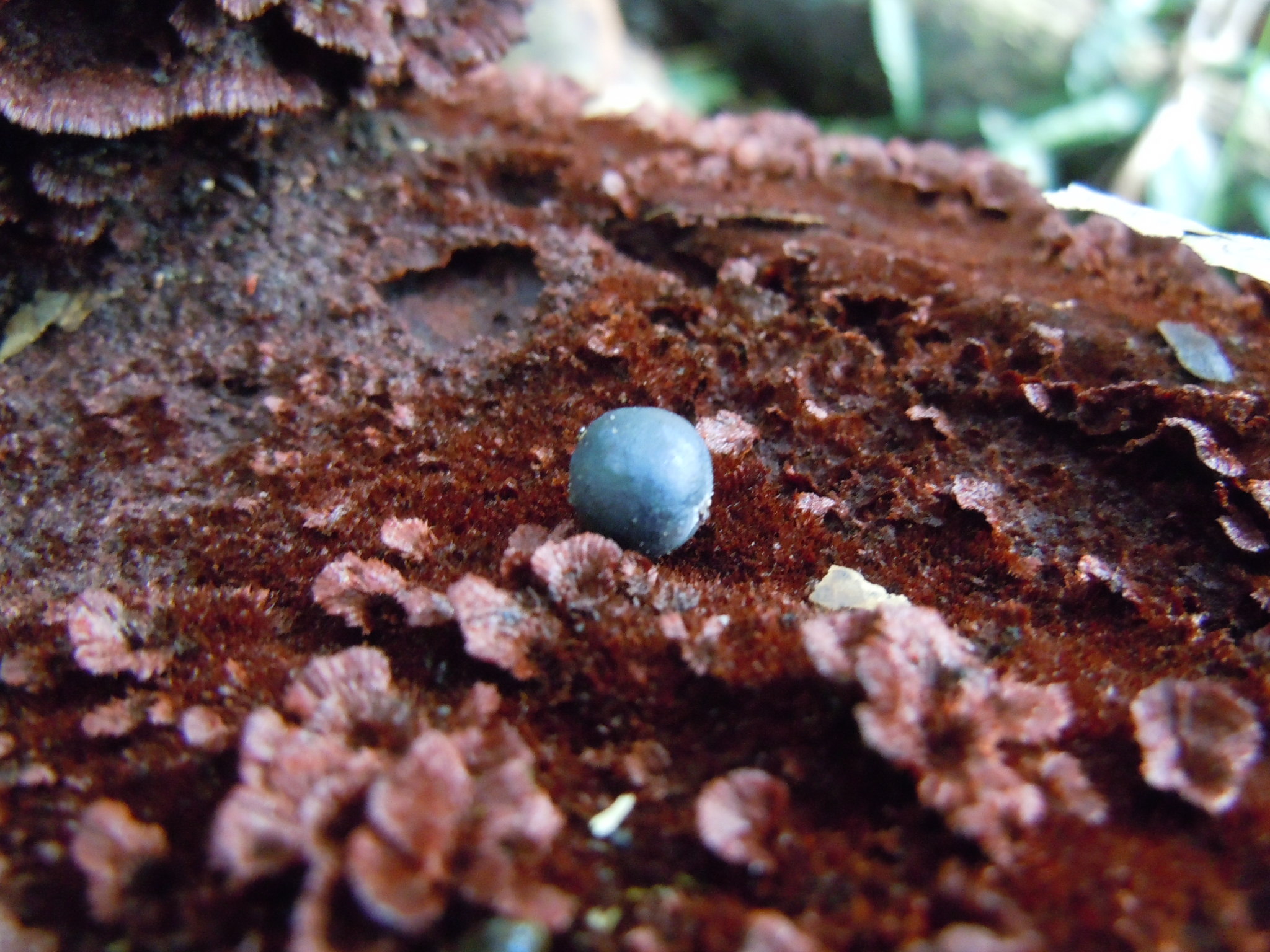 生えてきたものなのか、落ちてきて乗ったのか、誰かが置いたのか。赤い絨毯の上につやつやの黒い玉。玉台の座布団に飾られているみたいで目にとまりました。