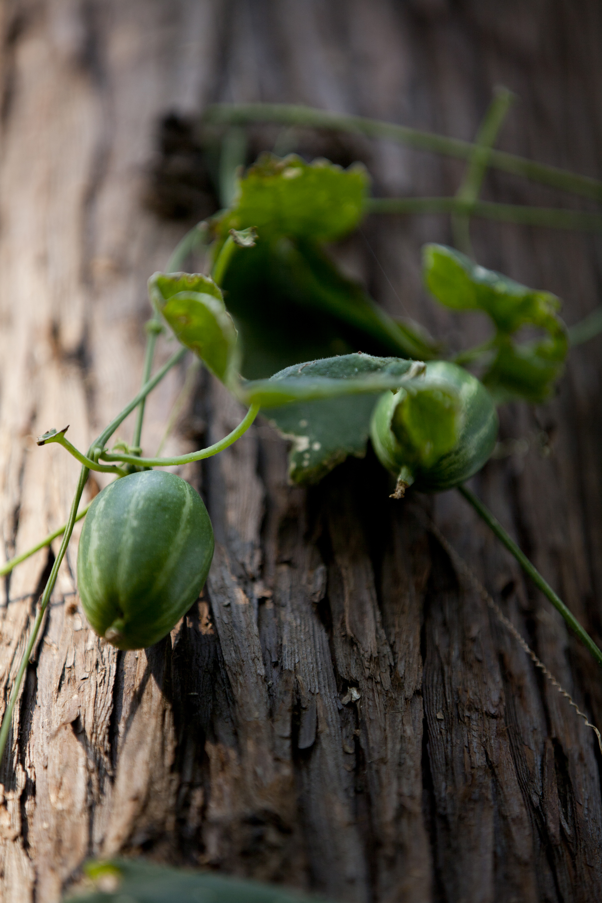 赤く色づく前のカラスウリ。名前の由来については諸説あるようですが、唐から伝来した朱墨「唐朱」に実の色が似ている事から。だとか。