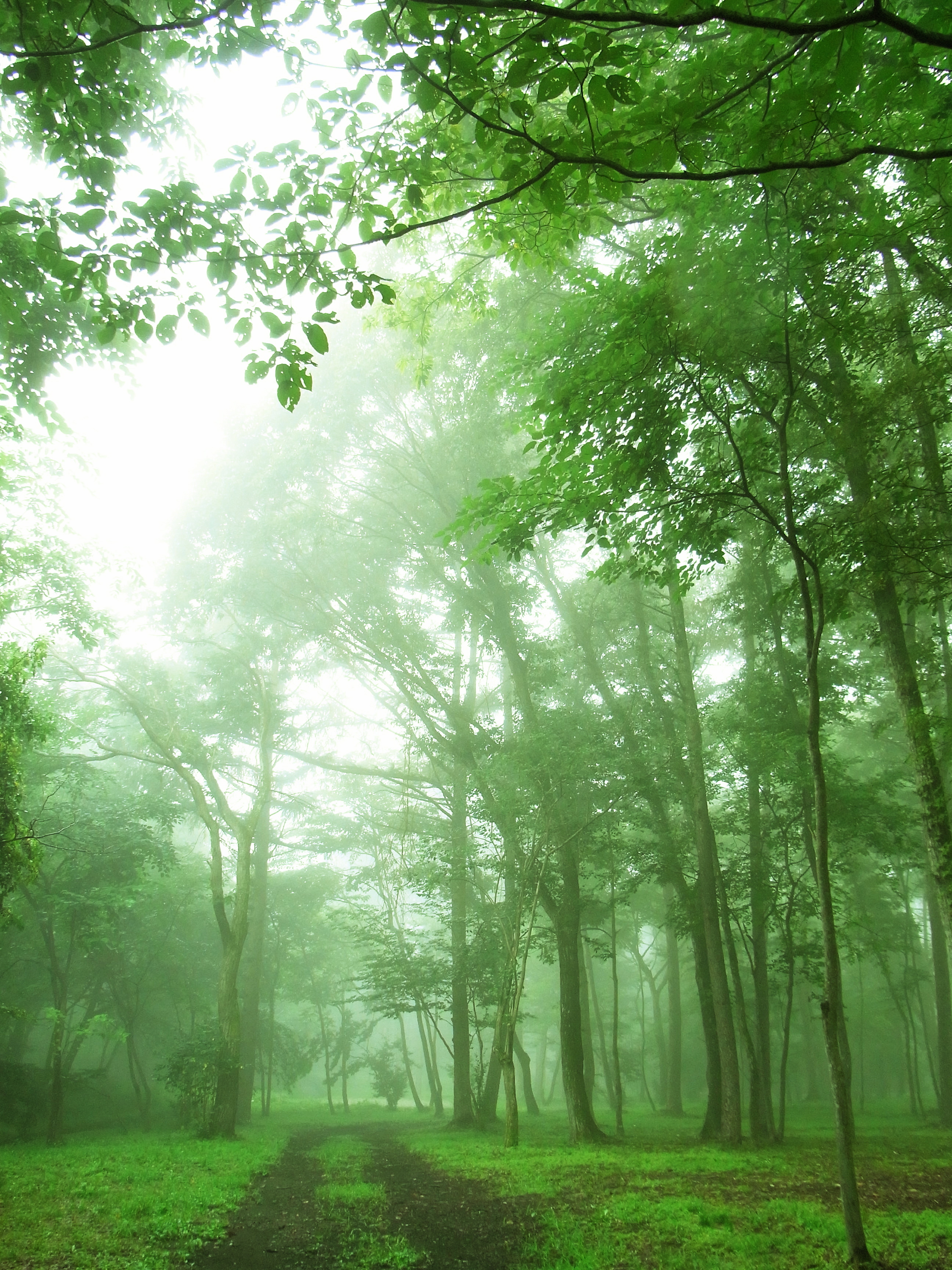 雨上がりの朝の森です。霧の向こうに何が在るのか探検をしたくなるようなそんな森でした。