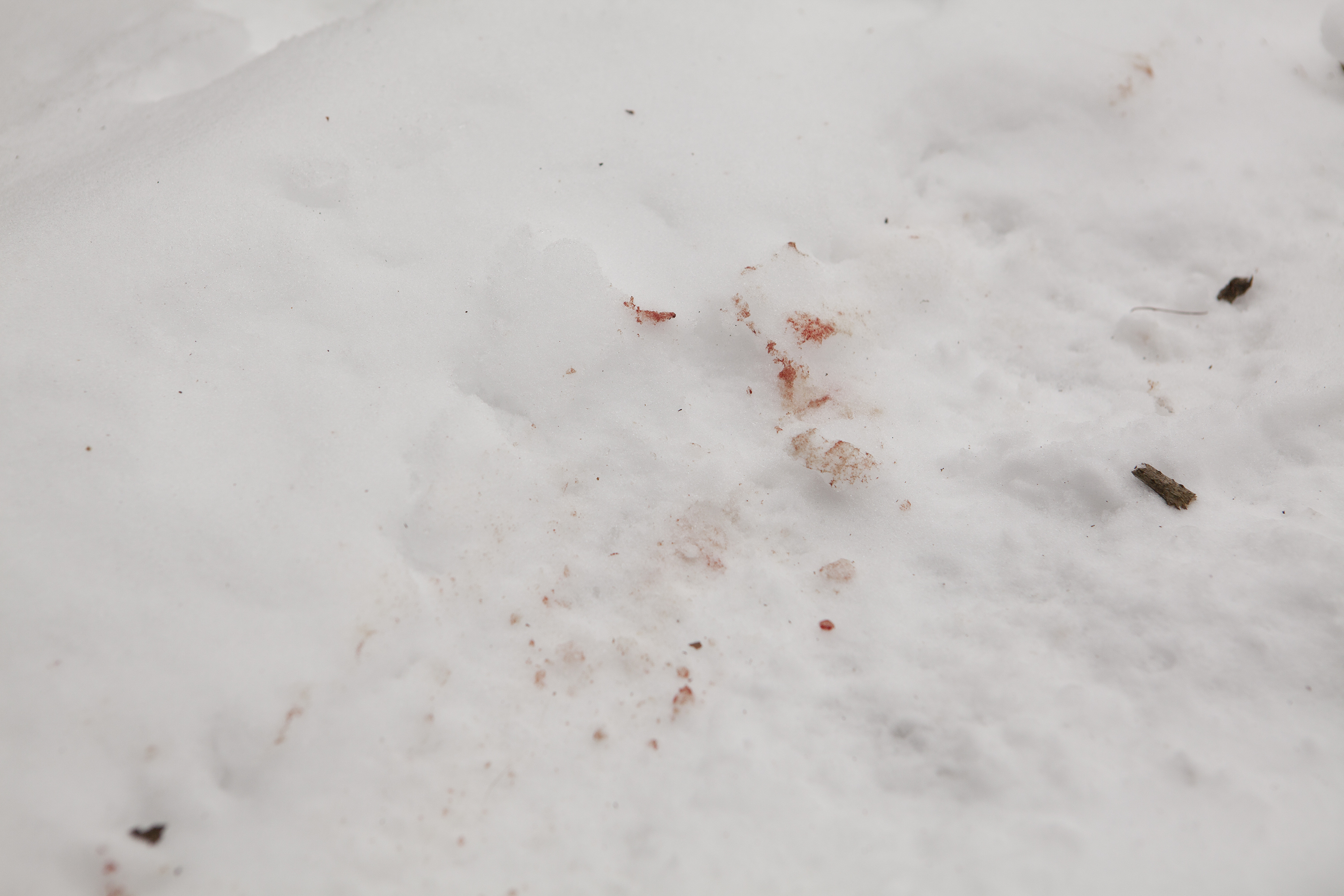 カメラ片手に雪山を散策中、フッと足下を見ると雪上に点々と滴る血痕。。