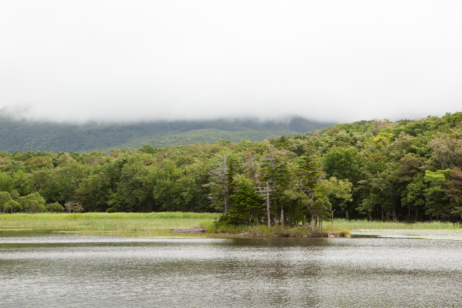 湖面に浮かぶ小島が特長の知床五胡の三湖。船で小島まで行ってみたい。