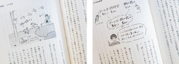 鳴き声の解説といえば、この本にも巻末に特別付録がついています。「シジュウカラの鳴き声を聞いてみよう」と題して、掲載されている7つのQRコードをスマホのカメラで読み込むと、縄張り宣言の「ツツピーツツピー」や、空にタカを見つけた時の「ヒヒヒ」などを聞くことができます。今まで聞き逃していた鳴き声がわかるようになるかもしれません。野生の鳥たちを驚かせないように、室内で音量に気をつけて聞くようにという注意書きにもシジュウカラへの愛を感じます。ちなみに本文イラストもすべて著者の手になるものです。手に取って見て楽しめる本なのでぜひどうぞ。読めば、耳から聞こえる世界がぐっと広がるはず。
