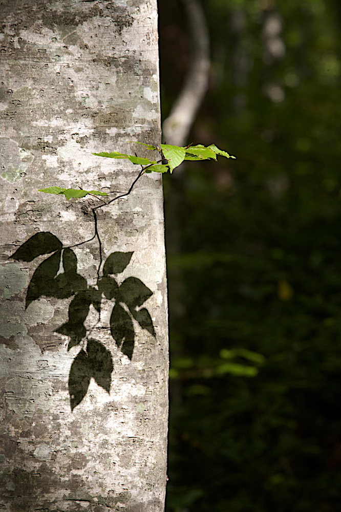 ブナの大木からちょこんと生まれた小さな小枝が、木漏れ日の力を借り、更に自らの分身を作り出していました。