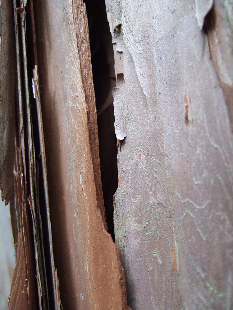 ヒノキの木肌が深くめくれていて、いつ落ちるのかなぁと思いながら、裂け目を覗き込んでいました。