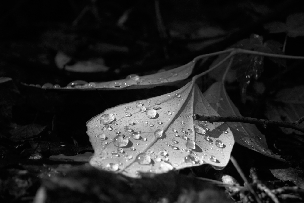 水滴が木漏れ日でガラス玉のように見えました。
