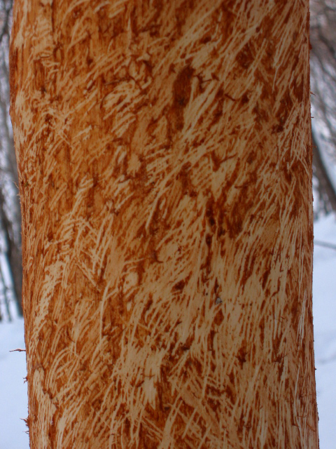 鹿が木の皮を歯でこそげ落としたあとです。