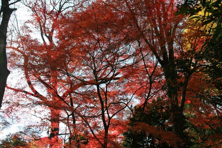 太陽光と紅葉が木の幹を赤く染めて幻想的な森になりました。目でも同じように見えましたよ。ビックエッグの隣にある水戸家上屋敷の日本庭園です。