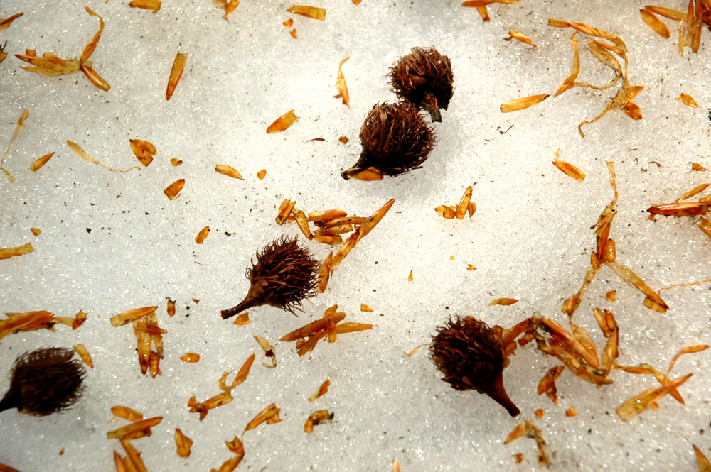 雪の上のブナの冬芽の殻