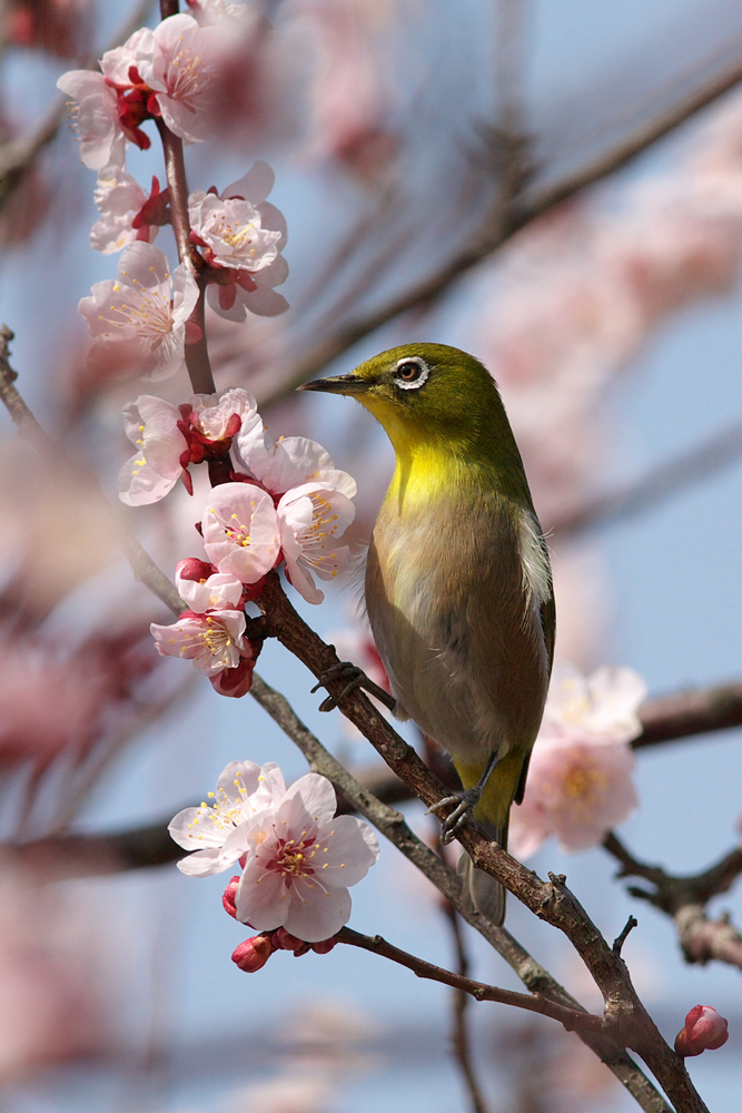 梅に囲まれた柔らかな光の中、凛とした佇まいが美しいメジロでした。