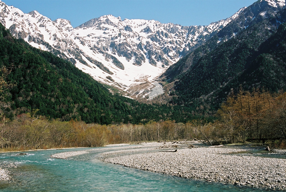 残雪の山(奥穂高岳)、緑豊かな原生林、清冽な流れ(梓川)