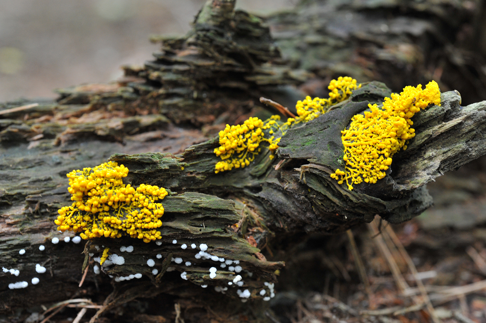 黄色の粘菌は、森の中でそこだけスポットライトを浴びたように見えました。