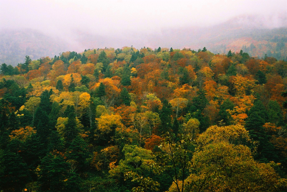霧雨の中、山道を歩いていると突然に霧が動いて、目の前にこんな紅葉の丘が出現。