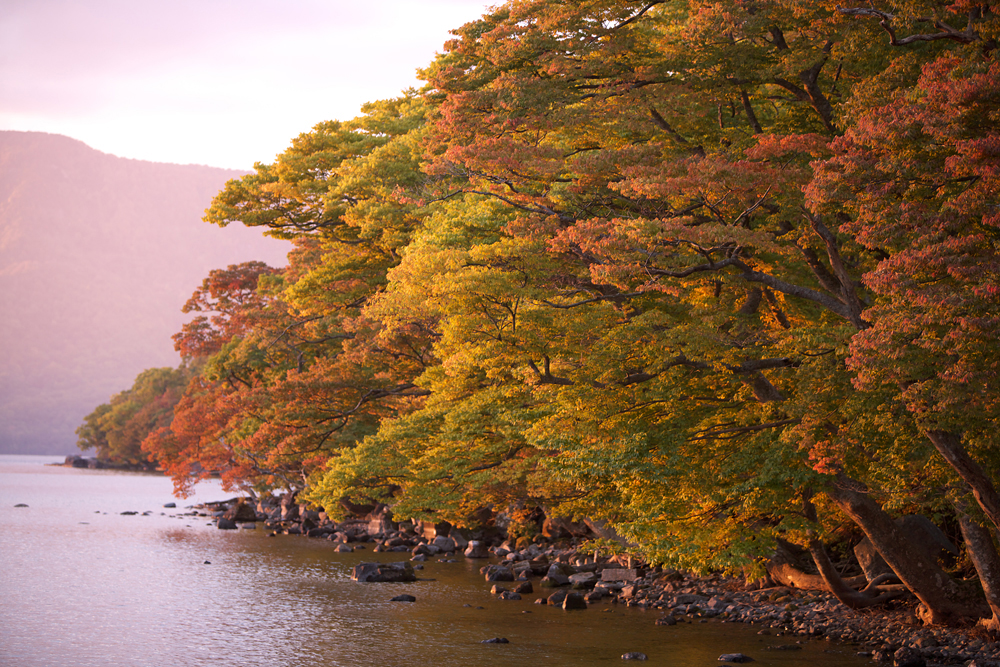 日没直前の赤い夕陽に照らさた湖岸の木々。昼間とはまた異なる、儚くも美しい風景でした。