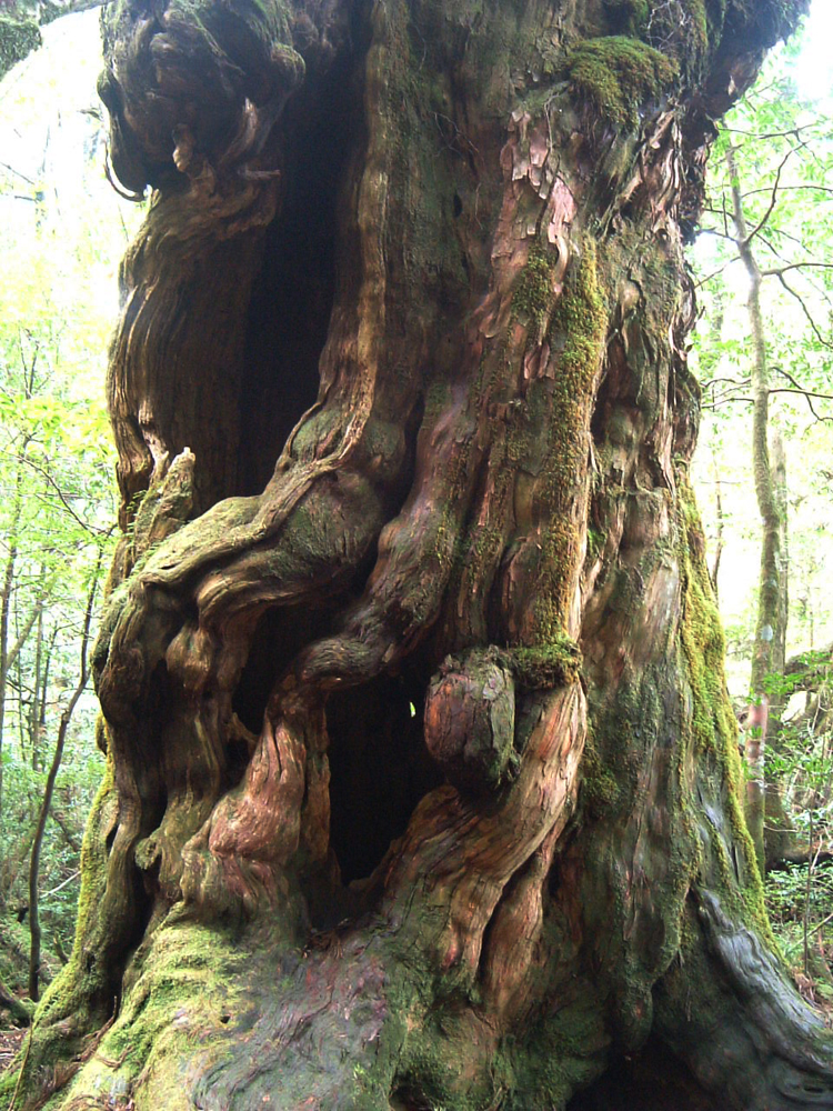 空洞が多く、衰えている部分はあるけれど、上の方にはたくさんの植物が着床していて、生きている木なのに、地面が続いているような大きな存在感がありました。