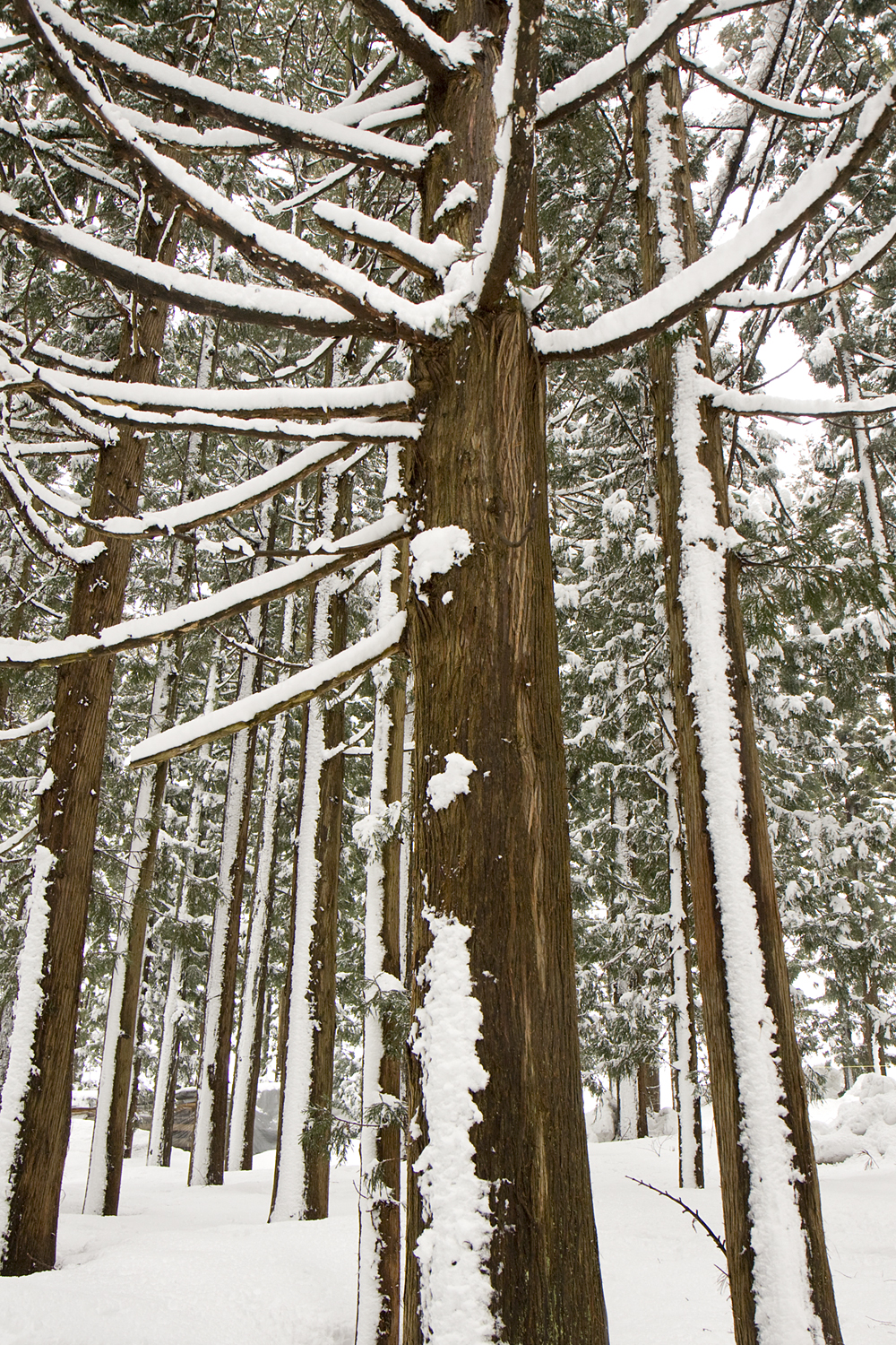 木に吹き付けた雪がスジ状に積もり、美しいストライプ模様に。