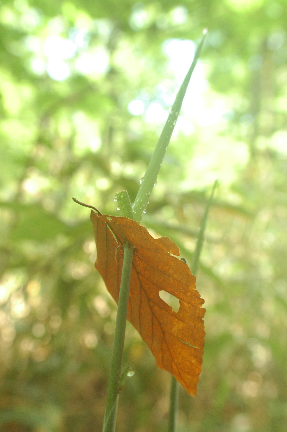 ブナの森に春が来て、クマザサがブナの落葉を突き破って成長しています。
