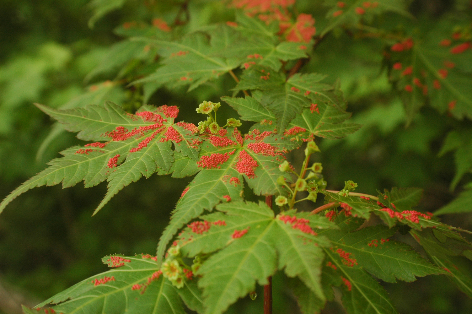 花を咲かせているミネカエデの葉についた、この赤いブツブツはなんでしょうか。