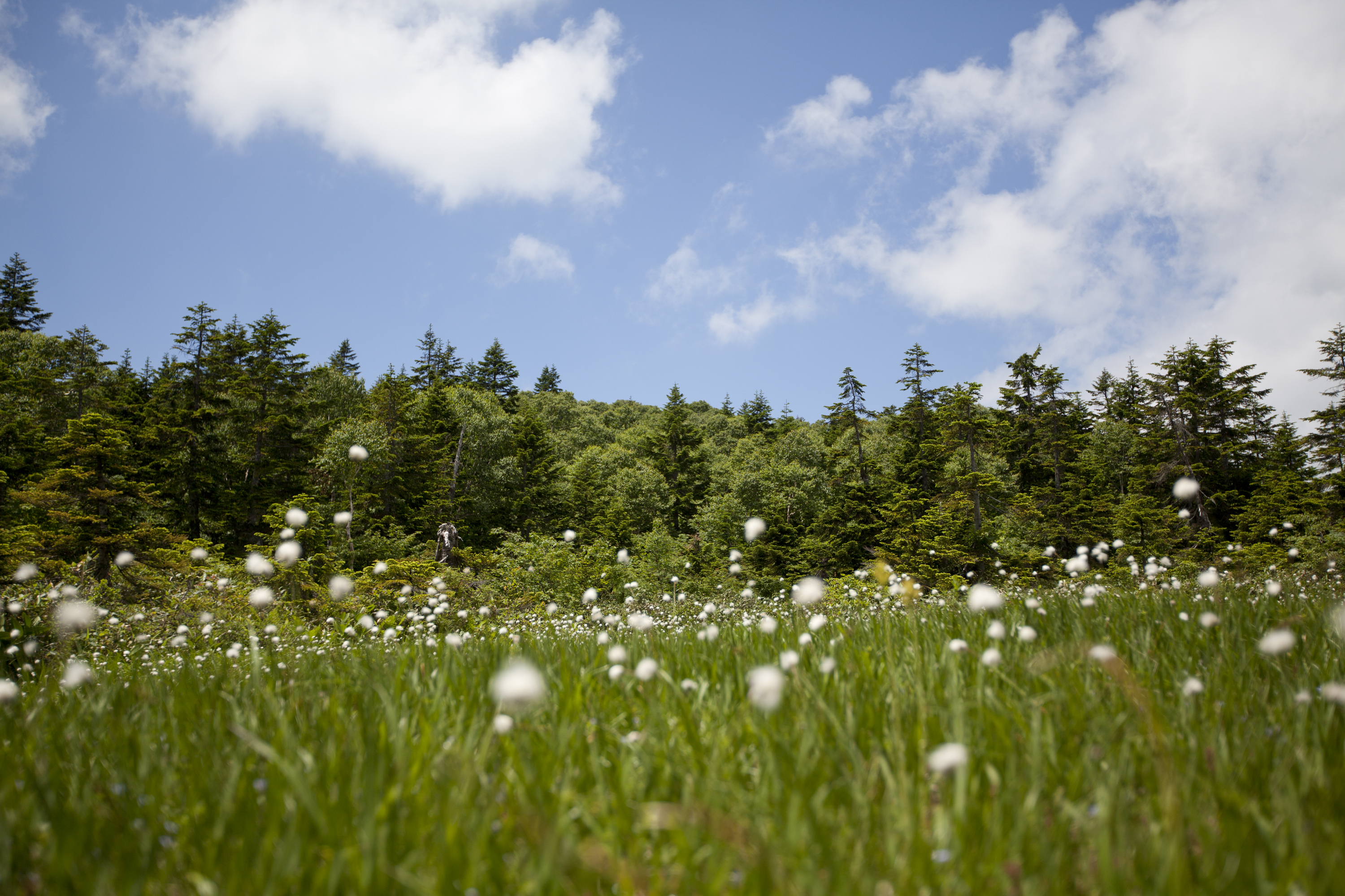 ワタスゲです。青空の下に一面の白いふわふわ。高原の風に飛ばされずに、しっかりとそよいでいる様子も健気でした。
