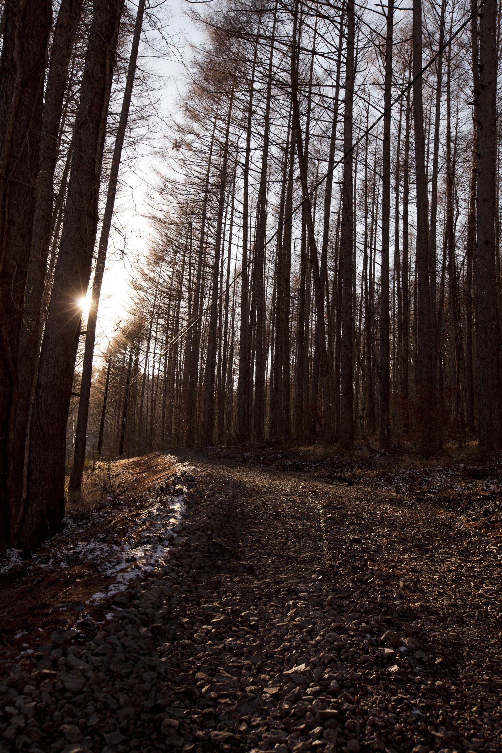 送電線をよけて一直線に開かれた森に、夕日が落ちて行きました。早い早い。つるべ落とし、とは言ったものですね。