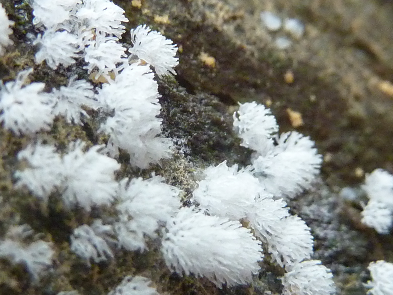粘菌の仲間でしょうか。白いカビのようなものを接写したら、ポンポンが! とてもかわいい。