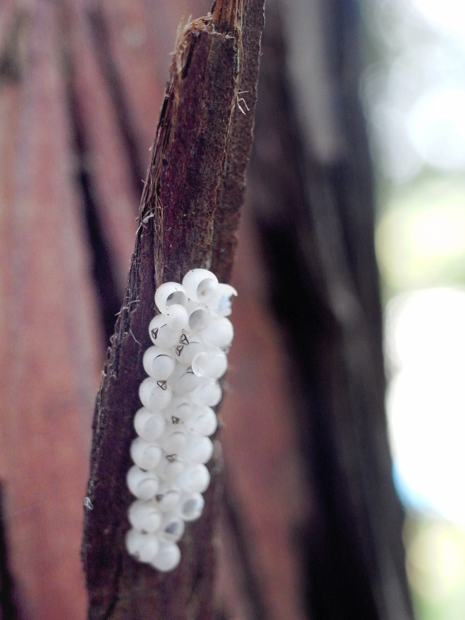 きれいに並んでいて、蓋が付いているところにグッときました。三角の小さい部分が留め具のようですね。調べてみたら、あの臭いニオイを放つカメムシの一種らしいです。