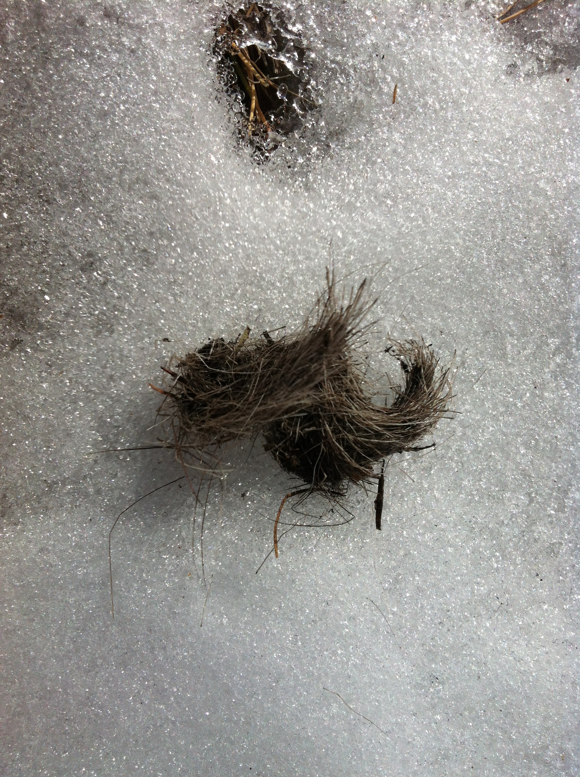 ニホンカモシカの観察ポイントで見つけた毛束。猪くんの毛かもしれないなぁ。と思いながら樹間を睨んでみたけれど、誰も現れなかった(^^)