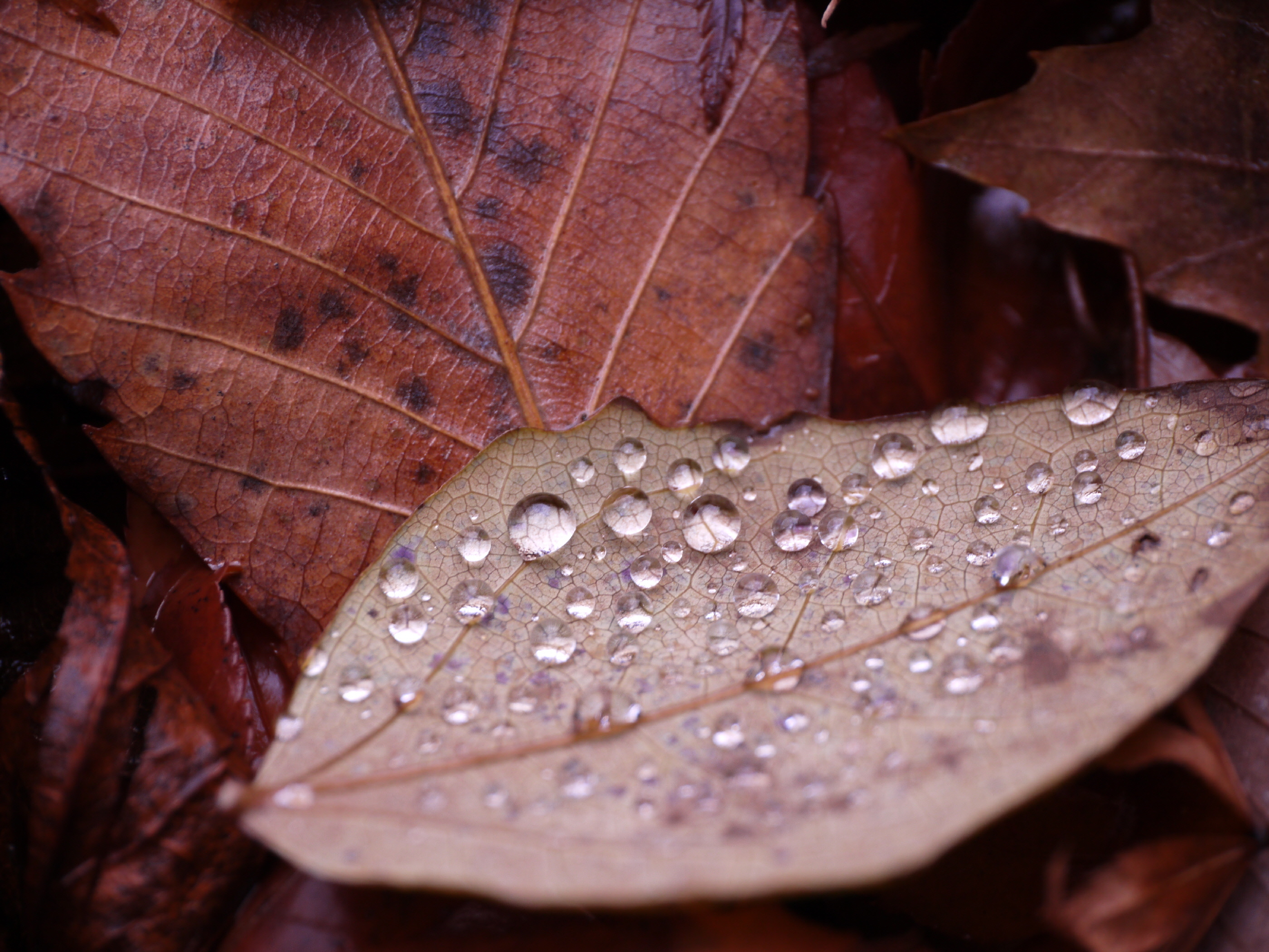 冬の原生林で出会ったシーンです。冬になると、落葉で森の中は明るくなって、見違えるようです。その落ち葉に夜露がついて、とても奇麗でした。