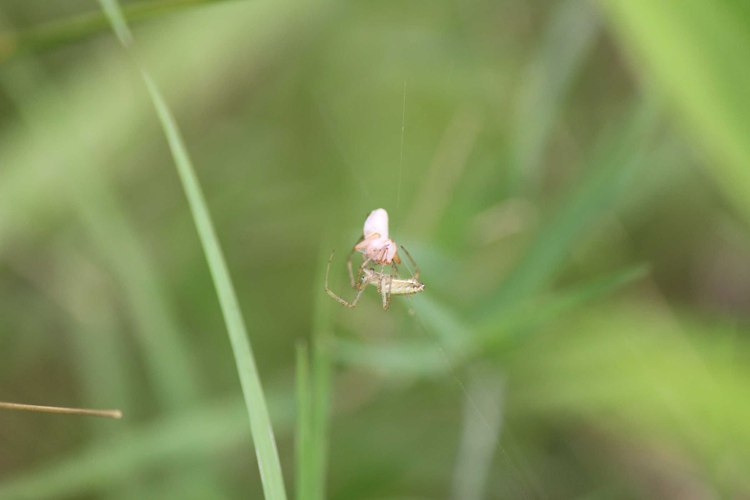小さな蜘蛛が、獲物を糸でぐるぐる巻きにしているところ。回転速度は目に見えないほどでしたが、休憩した瞬間の一枚です。ぜひまた見たい。
