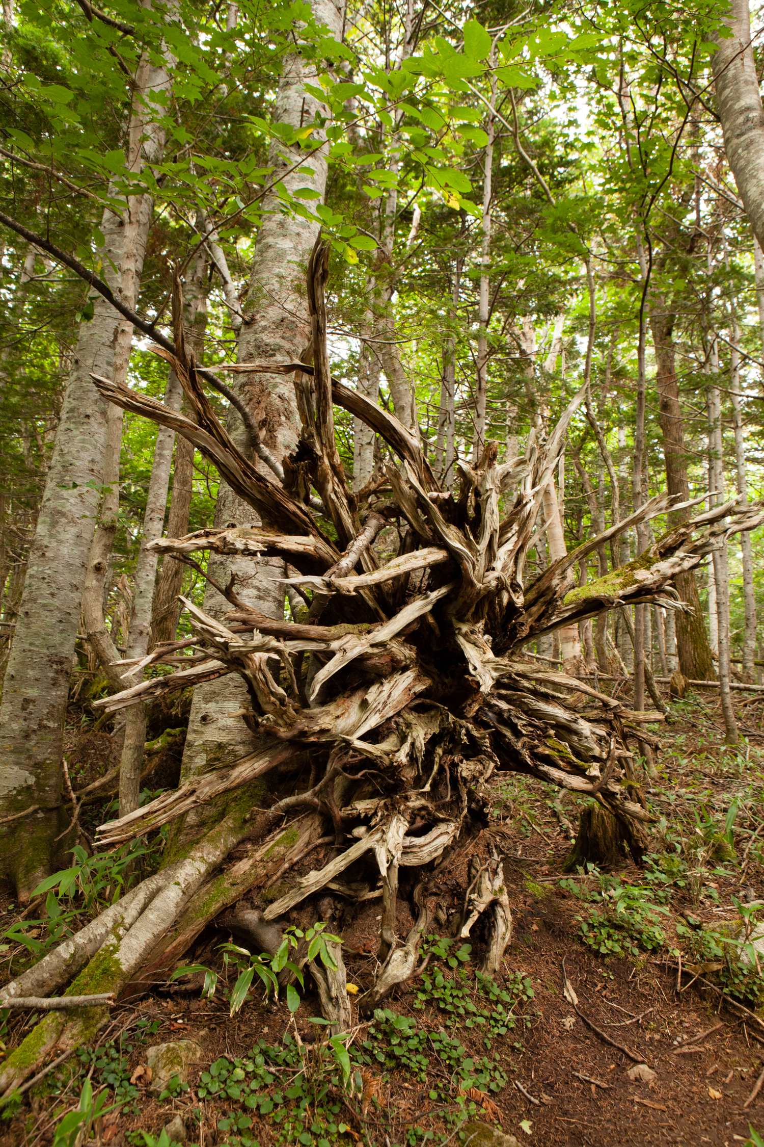 岩が多い山では根が浅く、このように放射状に広がるため、台風などで倒れやすいそうです。