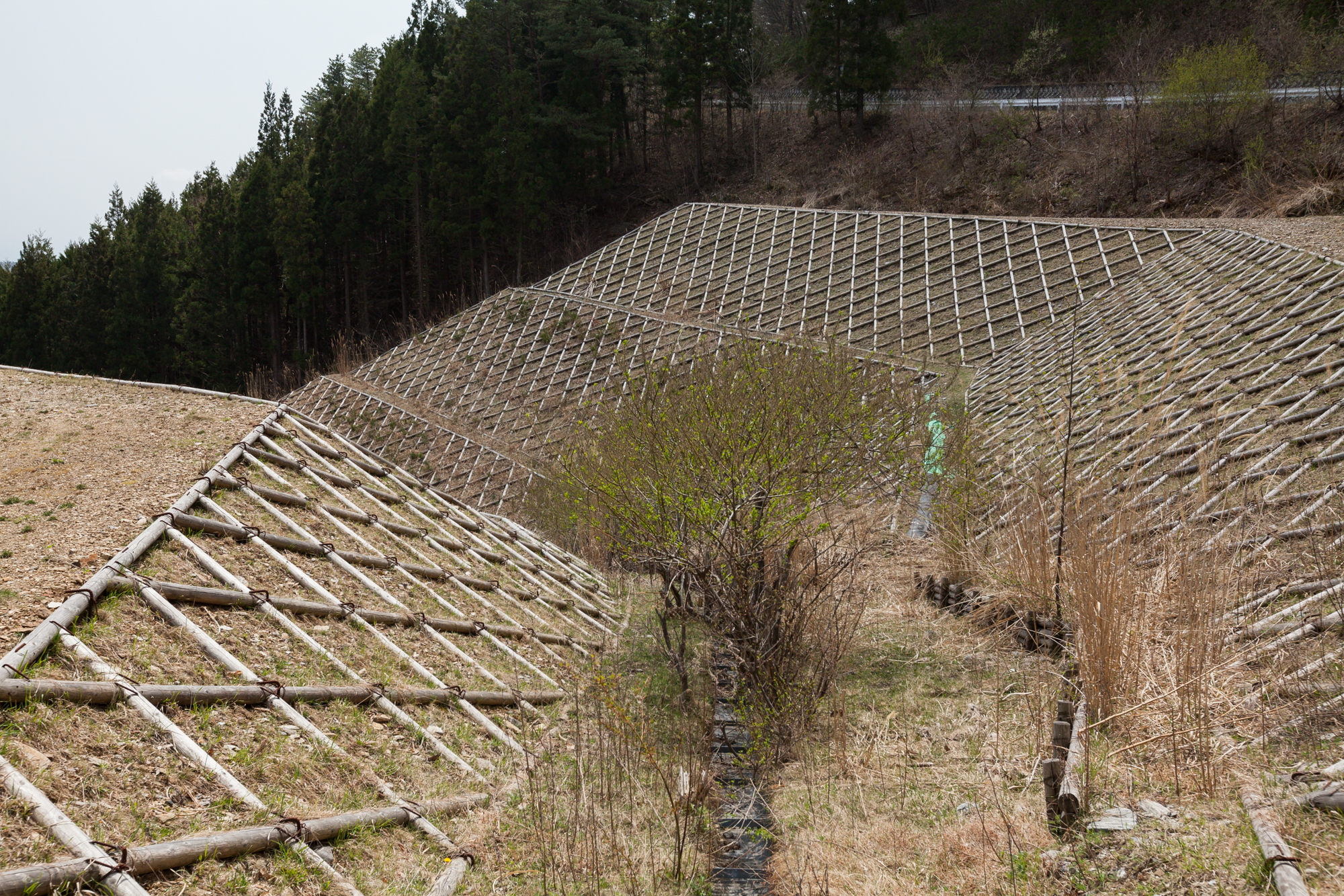 岩手県の住田町辺りだったかと思いますが、迷い込んだ山道で見た、幾何学模様のような木の法面。