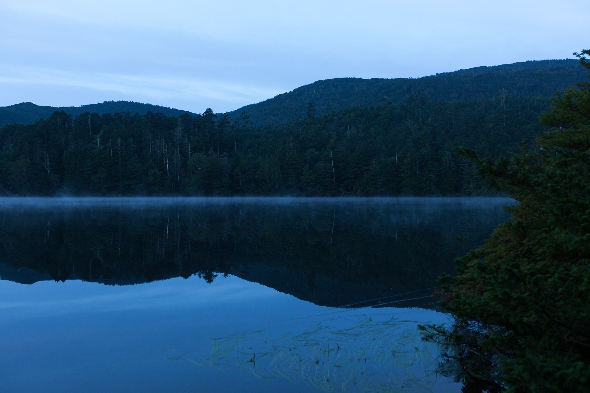 朝方の短いひととき、ゆっくりと白駒池の水面を漂う朝霧。早起きして良かった!