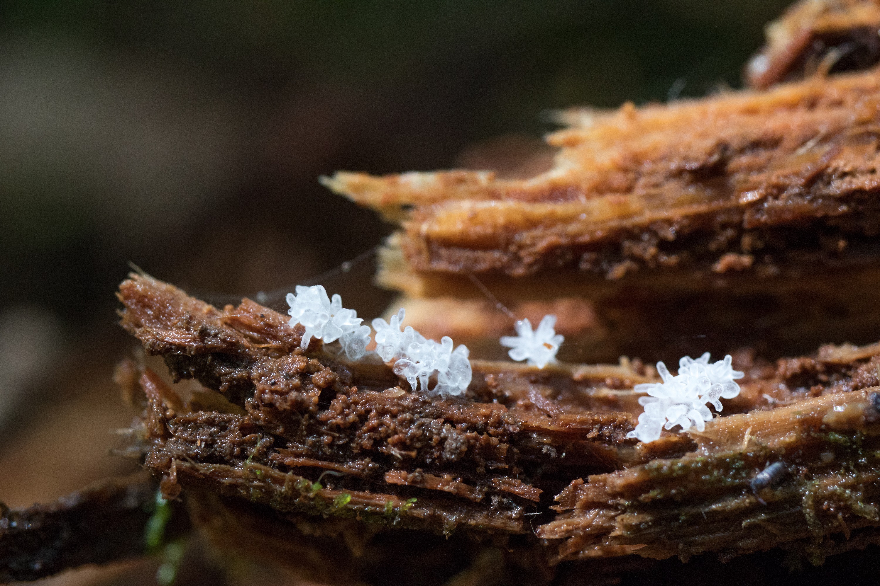 倒木を裏返したら真っ白なツノホコリ(?)が顔をのぞかせました