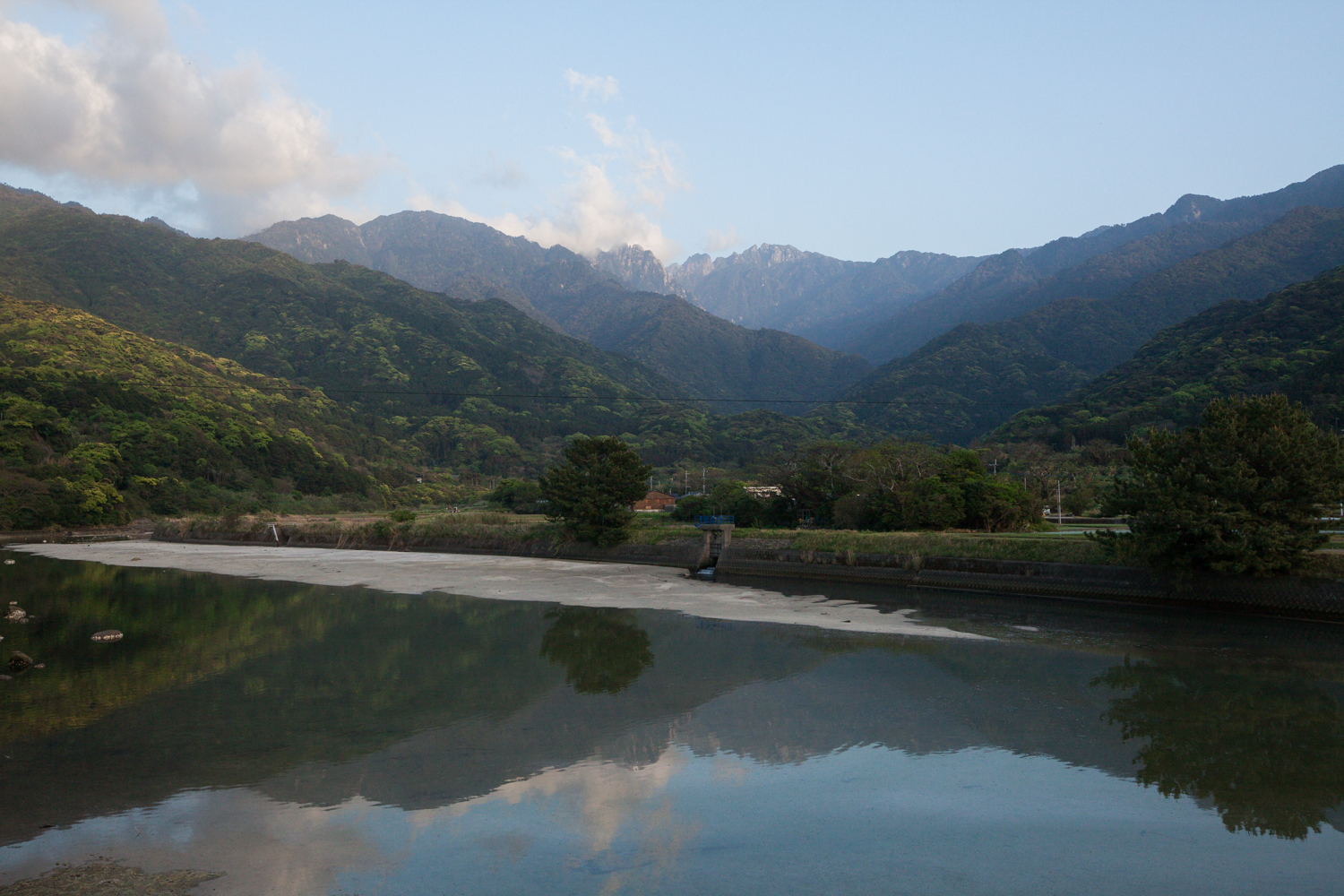 山並みに光が落ちる夕暮れ時の一瞬。屋久島の「宮の浦大橋」から。