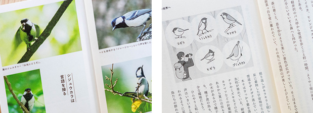 鳴き声の解説といえば、この本にも巻末に特別付録がついています。「シジュウカラの鳴き声を聞いてみよう」と題して、掲載されている7つのQRコードをスマホのカメラで読み込むと、縄張り宣言の「ツツピーツツピー」や、空にタカを見つけた時の「ヒヒヒ」などを聞くことができます。今まで聞き逃していた鳴き声がわかるようになるかもしれません。野生の鳥たちを驚かせないように、室内で音量に気をつけて聞くようにという注意書きにもシジュウカラへの愛を感じます。ちなみに本文イラストもすべて著者の手になるものです。手に取って見て楽しめる本なのでぜひどうぞ。読めば、耳から聞こえる世界がぐっと広がるはず。